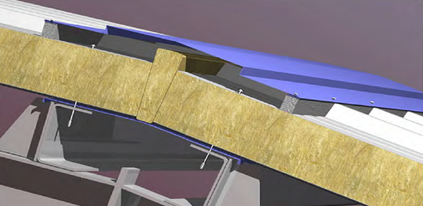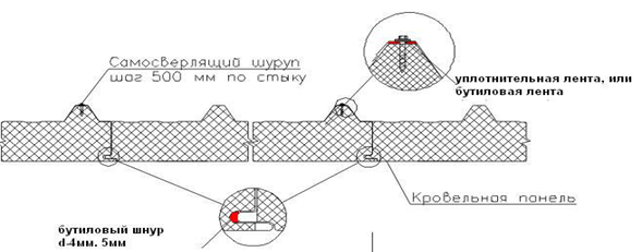 Непосредственно перед монтажом кровельных панелей требуется закладывать в продольное соединение панелей (т. е. в «паз» замка) бутилкаучуковый шнур (Ø 3-5мм) с внутренней стороны кровельной панели.