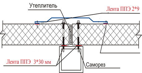 ВАЖНО! Для защиты полимерного покрытия панелей от возможных повреждений из-за вибрации при ветровых нагрузках и естественного микротрения в течение года при эксплуатации здания применяются уплотнительные ленты ППЭ РуфИзол, а также бутиловые ленты и шнуры.